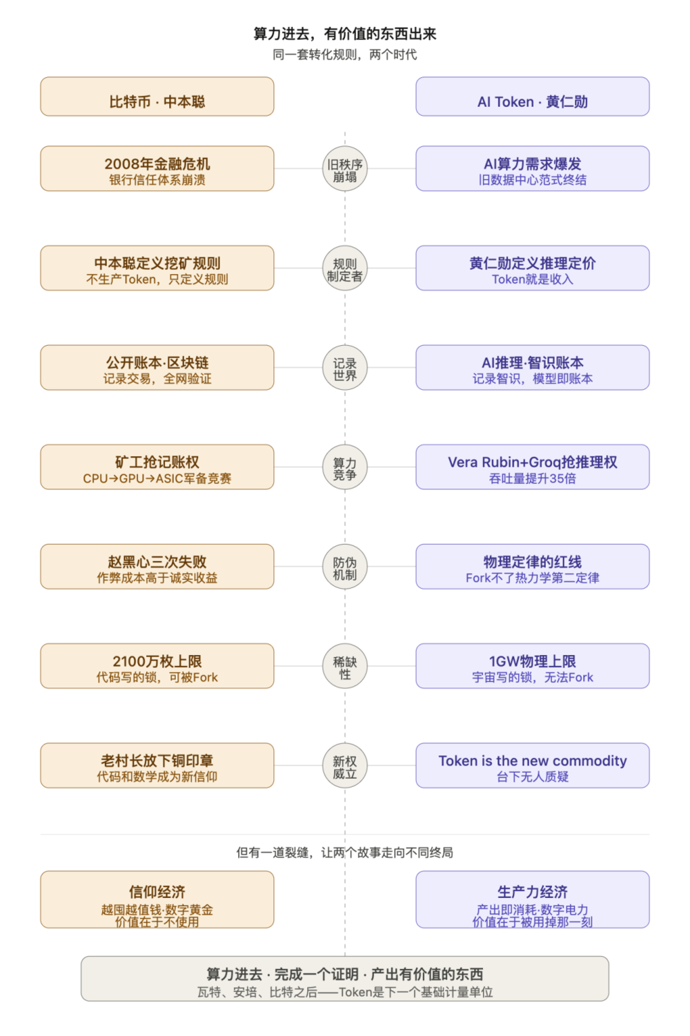 矿工花电费挖 Crypto Token 卖掉;推理模子花电费产出 AI Token,按百万计价卖给开垦者和企业。左边是电表,右边是收入,中间标准不同,两端富饶相似。