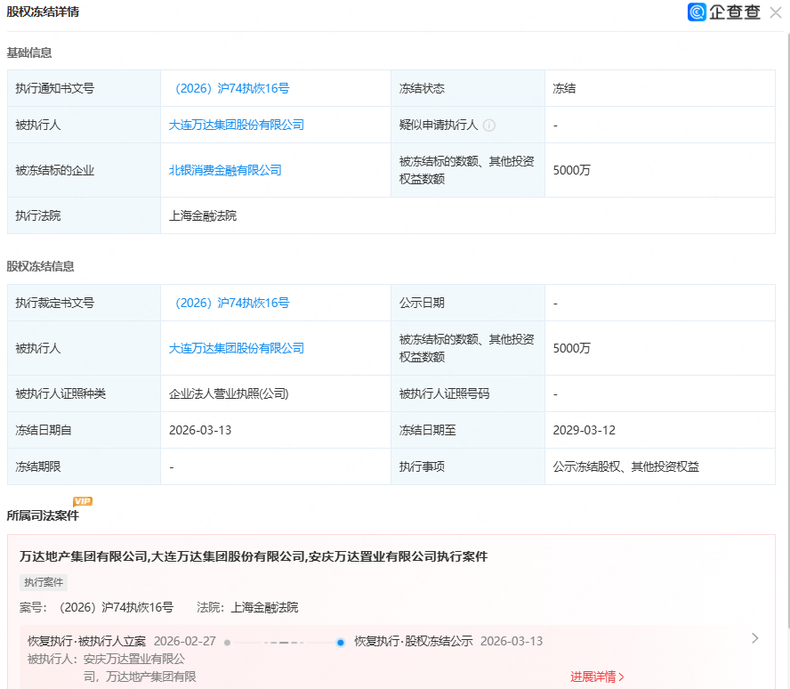 近日,企查查自满,大连万达集团股份有限公司抓有的北银花费金融有限公司5000万股权被上海金融法院冻结,冻结期限自2026年3月13日起至2029年3月12日止,为期整整三年。