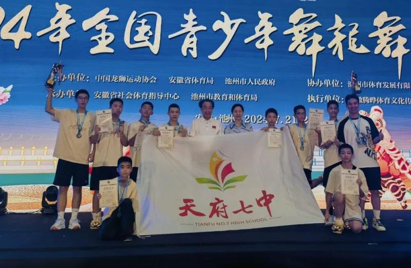 图为天府第七中学北狮队在2024年寰宇青少年舞龙舞狮锦标赛上得到创意龙狮冠军。