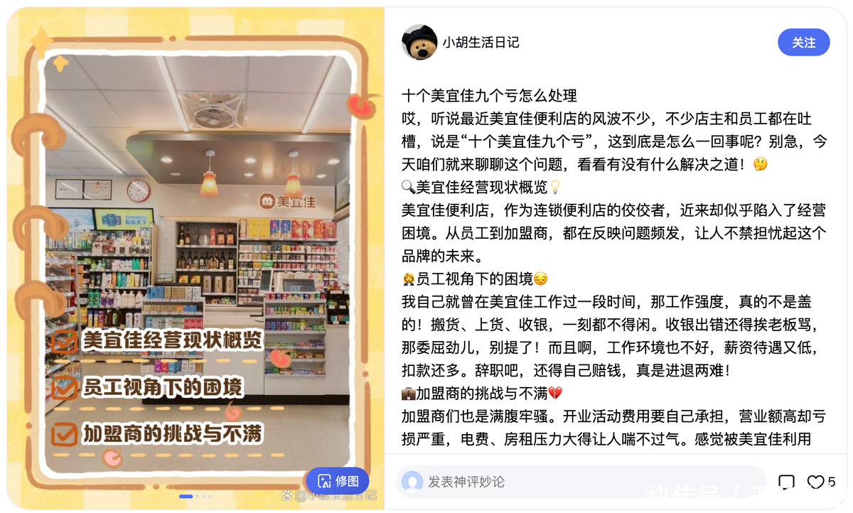然则,当褪去限制光环,好意思宜佳的傲气似乎莫得名义看起来那么肤浅。比如最近在荟萃上一篇题为“十个好意思宜佳九个亏奈那儿理”的帖子,揭示出一个敏锐的问题:好意思宜佳限制第一的宝座,是否正以万千小店主浅陋利润为代价?