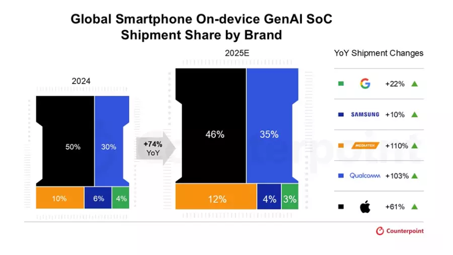 阐发市集考核机构Counterpoint的最新《2025年第二季环球智妙手机SoC出货与预测温存讲述》指出,2025年具备GenAI功能的聪惠手机SoC出货量将占环球总量的35%,年增长达74%。这一增长动能主要来自于GenAI功能在各价位带的快速渗入。Apple展望将以46%的市集占有率稳居跳跃,高通 (Qualcomm ) 则以35%居次,联发科以12%名轮番三。