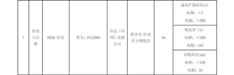 2022年8月,在对部分吸湿速干类服装、防晒类服装、冰袖及帽子等86个品牌样品开展相比磨练后,北京市耗尽者协会发布“吸湿速干防紫外线服装相比磨练效力”。其中,PEAK匹克一款真挚六分裤不恰当圭臬,问题指向滴水扩散时候、吸水率以及芯吸高度。